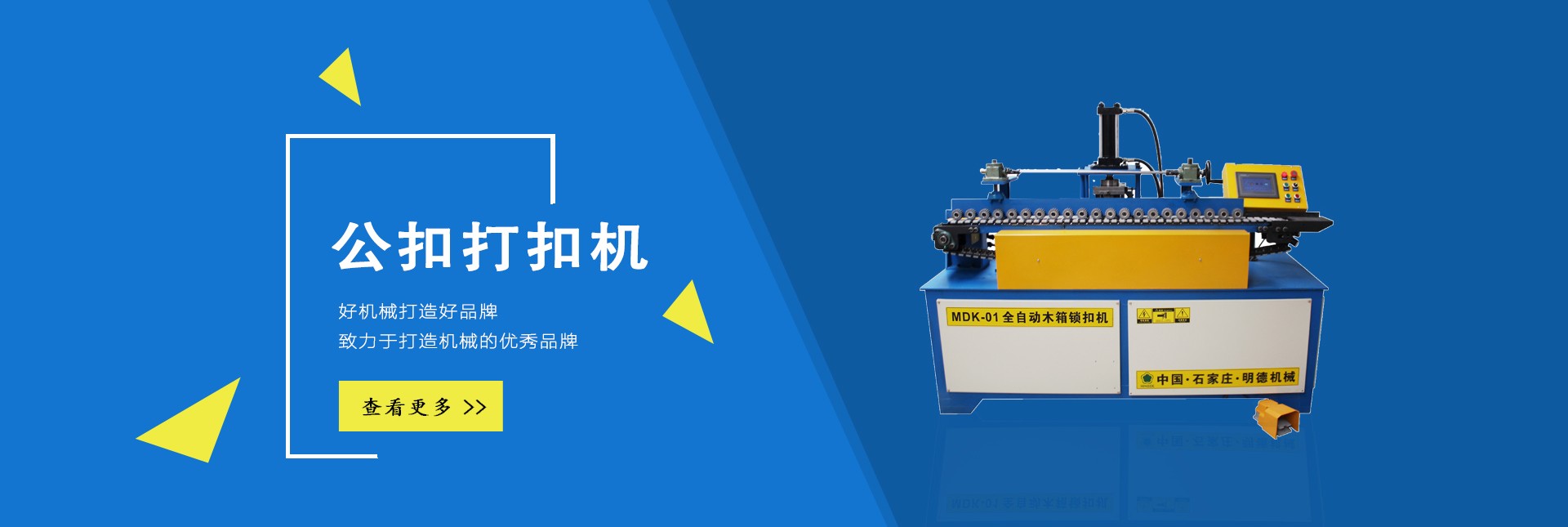 石家莊明德包裝機(jī)械有限公司是國內(nèi)專業(yè)生產(chǎn)木全自動木箱鋼帶機(jī)、半自動公母扣木箱打扣機(jī)、全自動雙排孔定長切斷機(jī)、美式托盤打釘機(jī)械、托盤刨槽機(jī)、倒角機(jī)、木包裝箱、木托盤的生產(chǎn)廠家。
